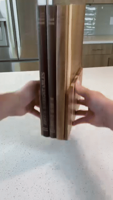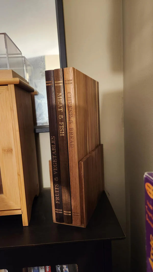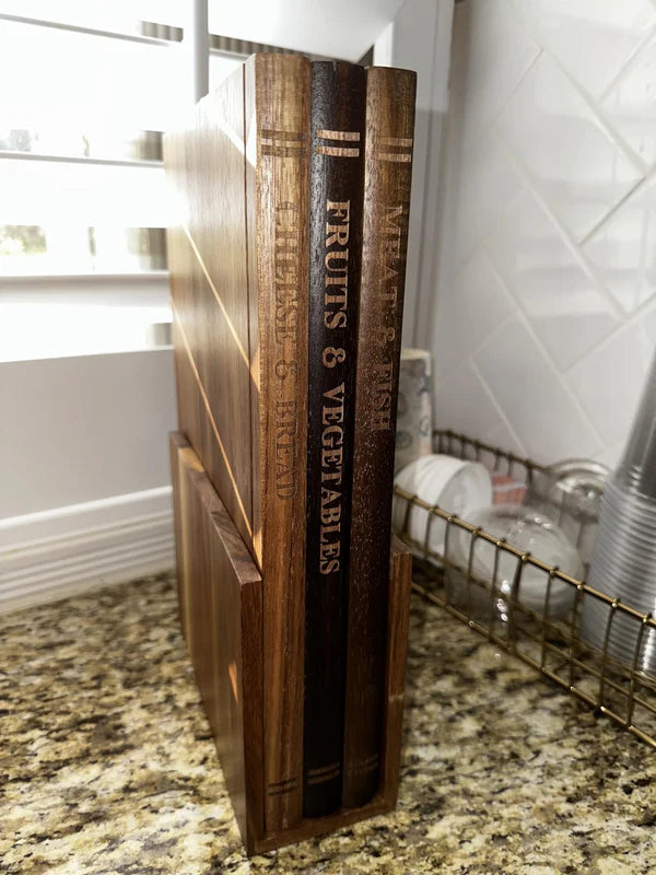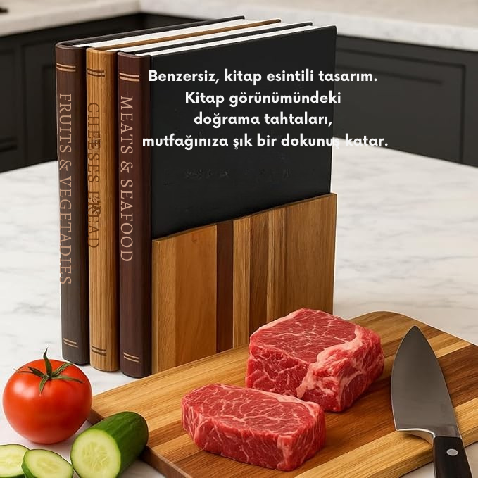 Gıdaya özel ayrı tahtalar, premium akasya ahşabı ve kitap tasarımlı şık görünüm.